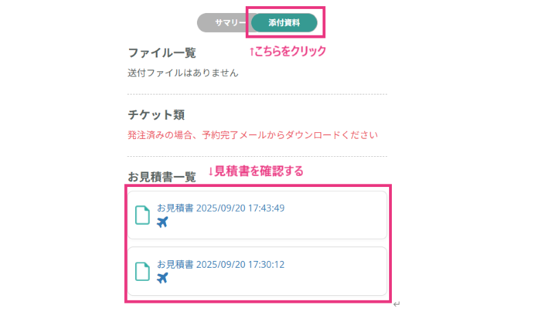 チャットページ内、画面右側にある「添付資料タブ」からも見積書の確認が可能です。
