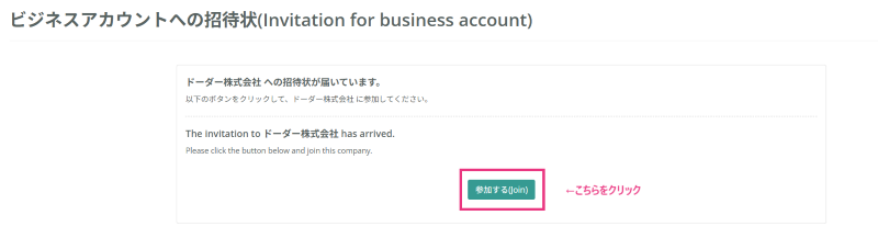 招待を受けている会社名を確認し、「参加する」をクリックします。