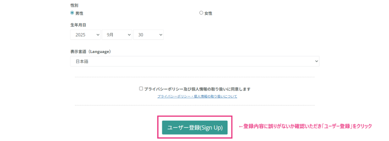 登録内容に誤りがないか確認いただき、「ユーザー登録」をクリックすると登録完了です。