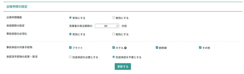 出張申請機能を利用するか否かの設定です。無効にすると、画面左のメニューバーから出張申請機能の反映が削除されます。 |