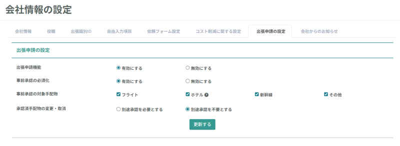 ・「出張申請機能」「事前承認の必須化」「承認済み手配物の変更・取消」の有効・無効を選択